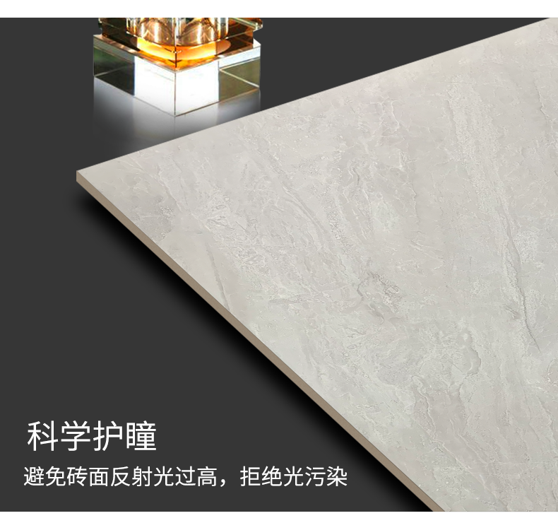 柔光瓷磚是磚面反射介于強光與弱光之間的一類瓷磚,其結(jié)合亮光類瓷磚的高調(diào)明艷裝飾和啞光類瓷磚的低調(diào)內(nèi)斂搭配效果,通過動態(tài)柔光蠟拋技術(shù),降低產(chǎn)品反光率,從而達到人體舒適的視覺感受以及無光污染的空間裝飾效果。優(yōu)點:1.視覺舒適,無光污染 2.堅固耐磨,不易刮花.