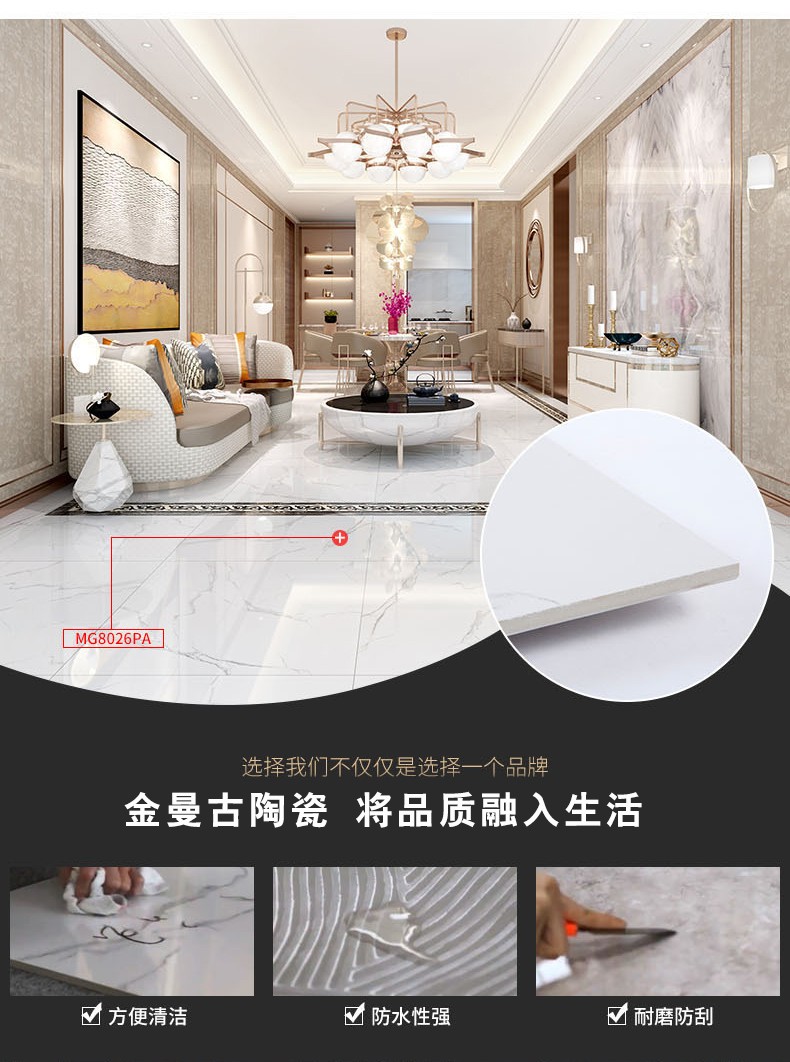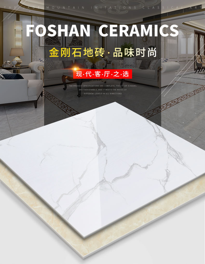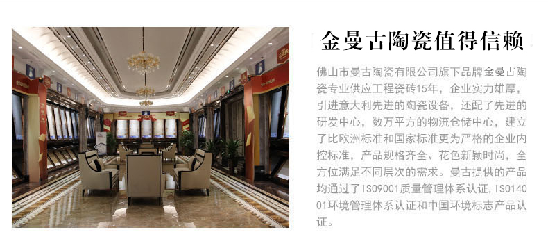 金曼古瓷磚廠家特價金剛石因高品質而得名,是一款極具天然石材效果和微晶石質感的仿石材瓷磚,它不但在價格、環保、耐用和清潔上極具優勢,在質感、規格、花色、重量等指標上,金剛石都遠遠勝于石材、拋光磚。相比其他種類的產品,它最大的特點可以用“高亮度、高耐磨、高平整、高逼真、高清晰、高環?!?。