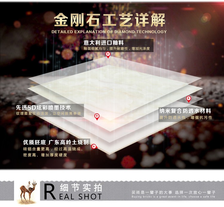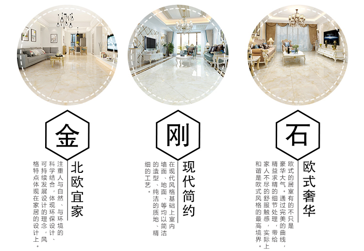 金曼古瓷磚廠家特價(jià)金剛石因高品質(zhì)而得名,是一款極具天然石材效果和微晶石質(zhì)感的仿石材瓷磚,它不但在價(jià)格、環(huán)保、耐用和清潔上極具優(yōu)勢(shì),在質(zhì)感、規(guī)格、花色、重量等指標(biāo)上,金剛石都遠(yuǎn)遠(yuǎn)勝于石材、拋光磚。相比其他種類的產(chǎn)品,它最大的特點(diǎn)可以用“高亮度、高耐磨、高平整、高逼真、高清晰、高環(huán)保”。