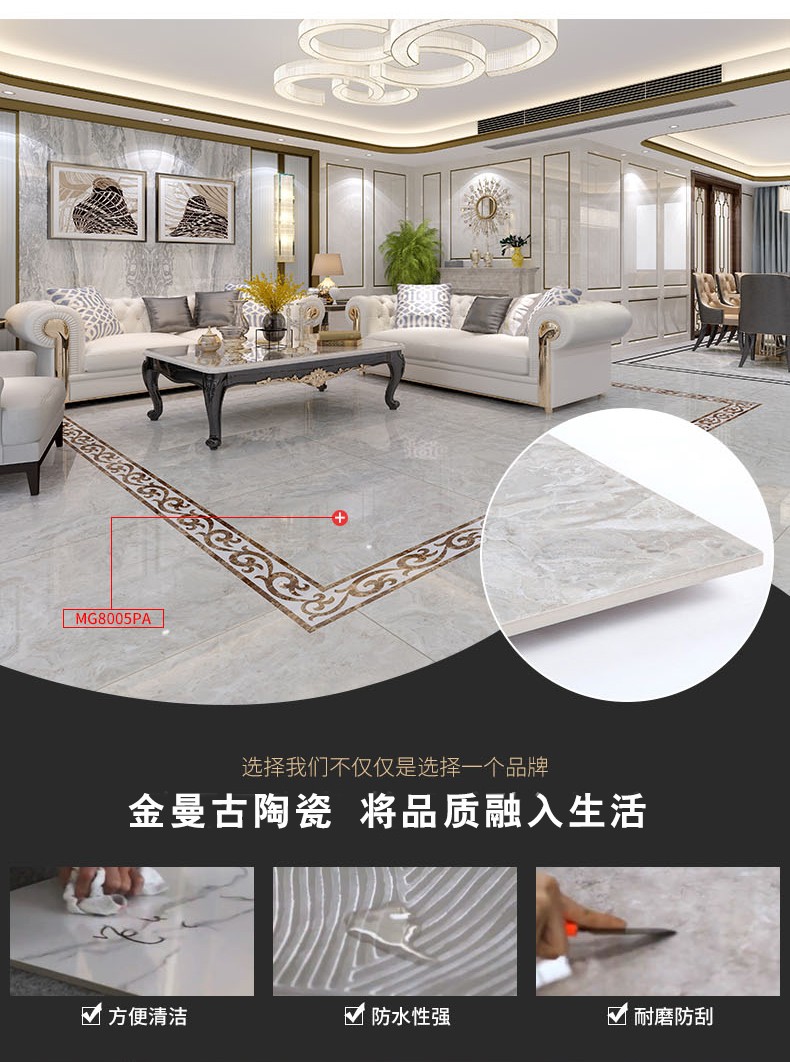 金曼古瓷磚廠家特價金剛石因高品質而得名,是一款極具天然石材效果和微晶石質感的仿石材瓷磚,它不但在價格、環保、耐用和清潔上極具優勢,在質感、規格、花色、重量等指標上,金剛石都遠遠勝于石材、拋光磚。相比其他種類的產品,它最大的特點可以用“高亮度、高耐磨、高平整、高逼真、高清晰、高環保”。
